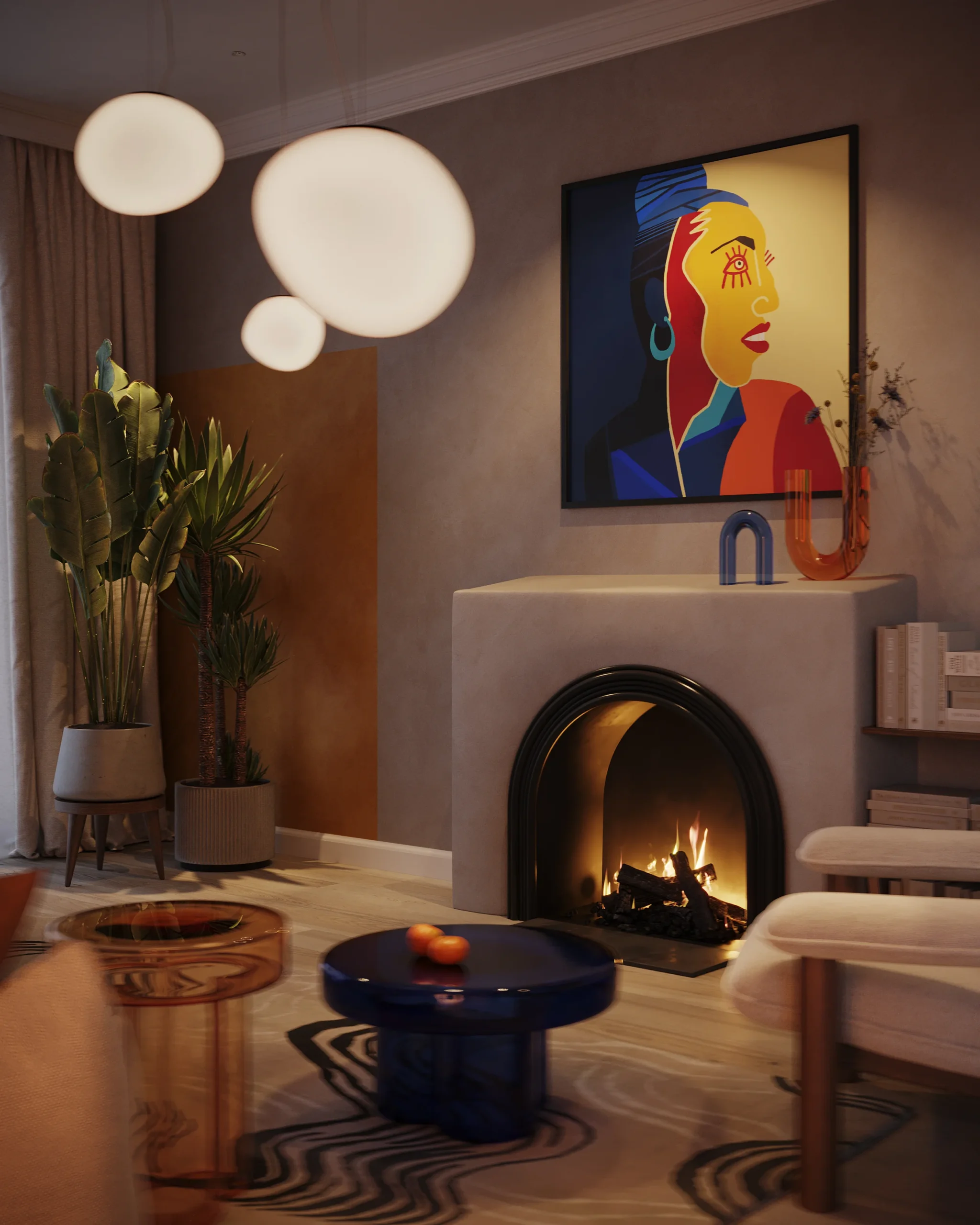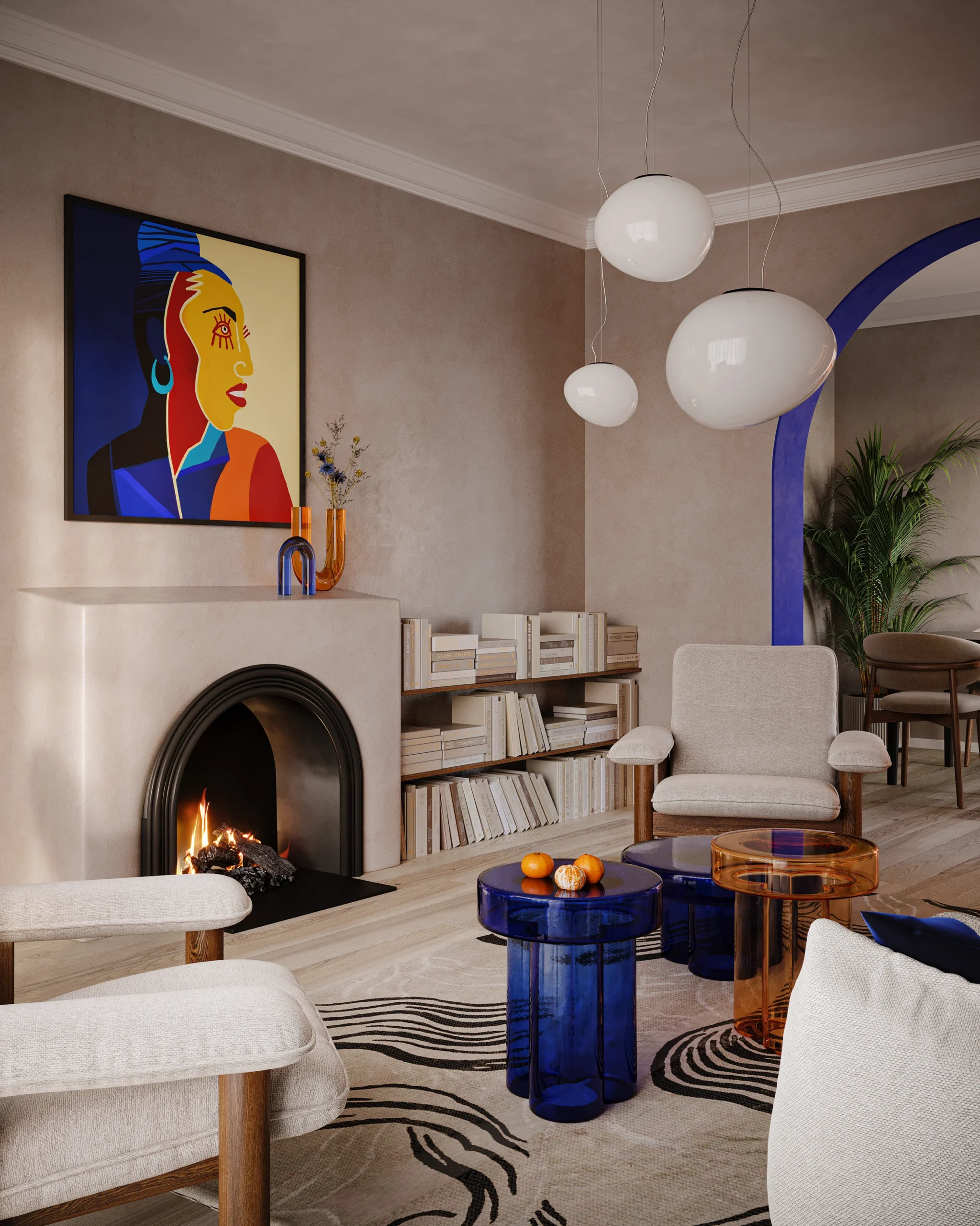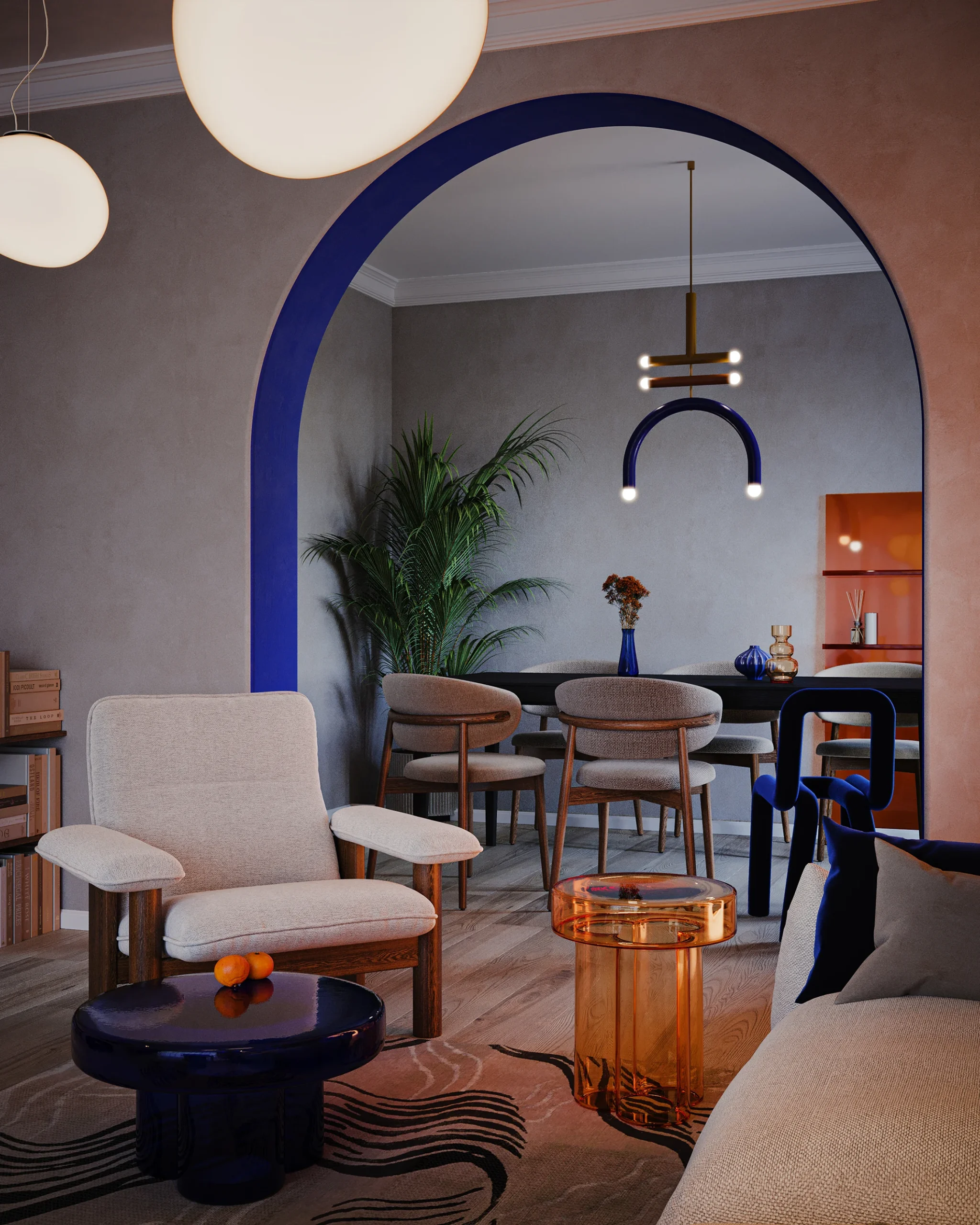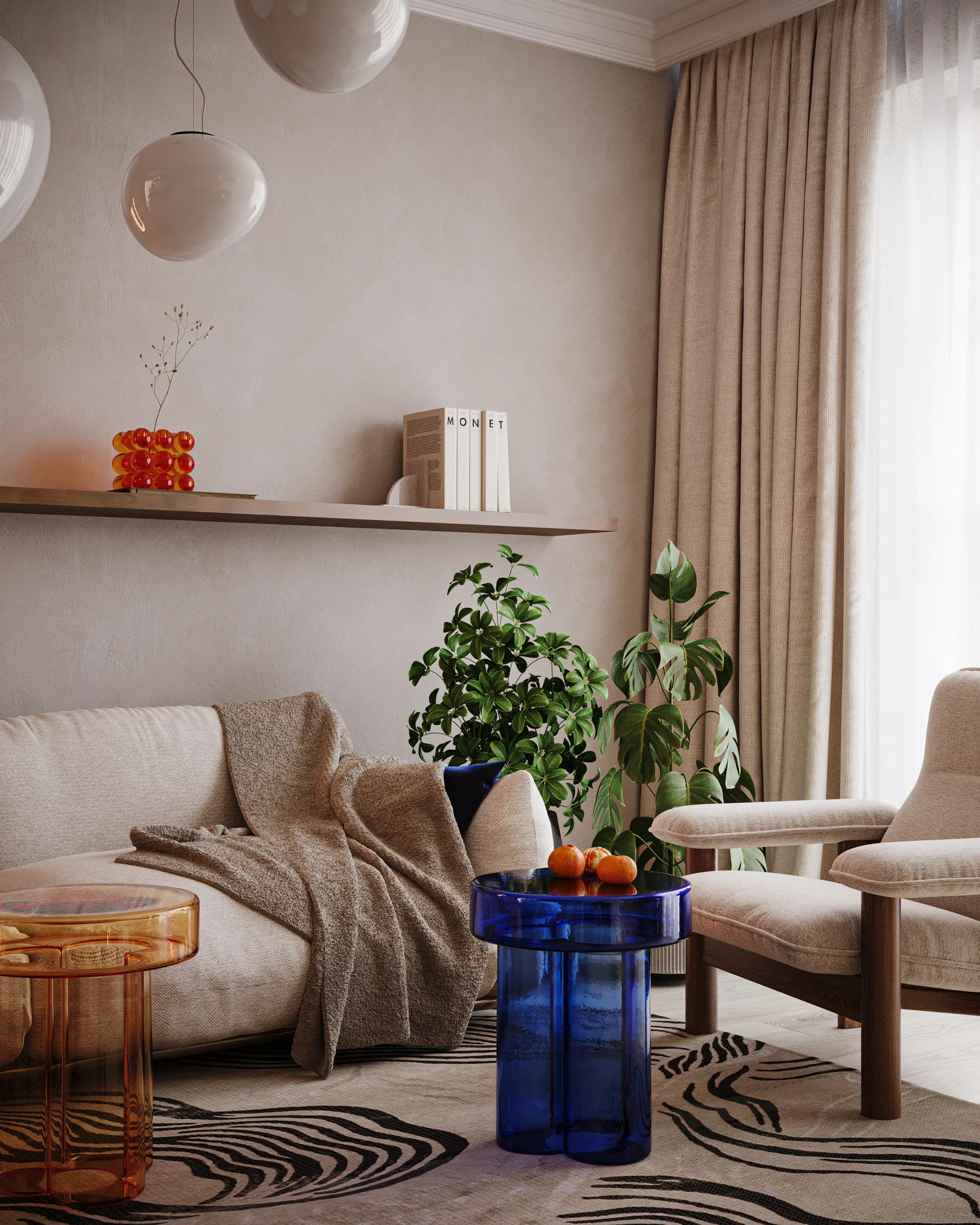 wnętrze o wyrazistym charakterze, w którym beżowa baza spotyka się z energetycznymi akcentami błękitu i pomarańczy. Subtelna elegancja przenika się tu z artystycznym duchem i lekko retro formą, tworząc przestrzeń pełną światła, ciepła i harmonii.