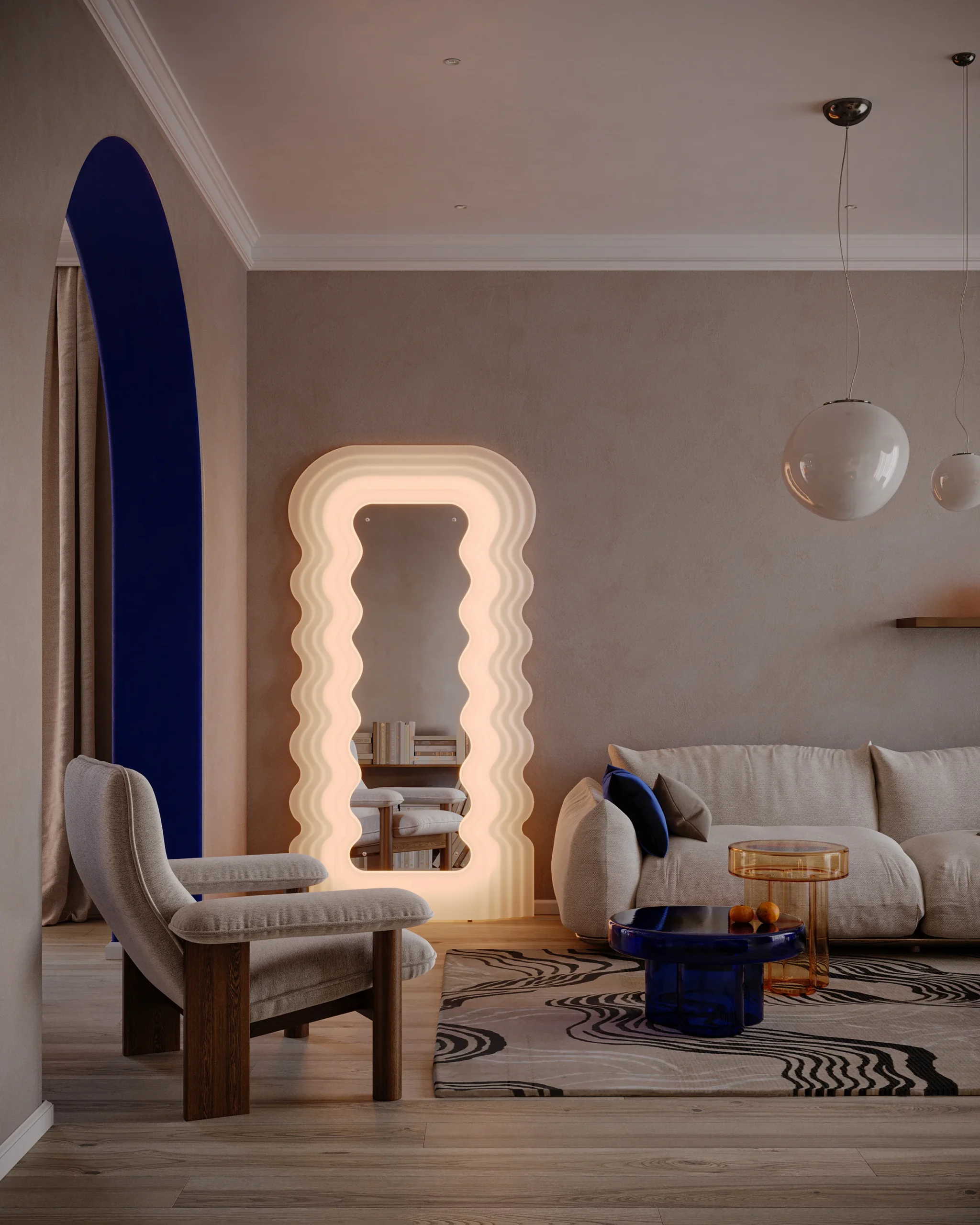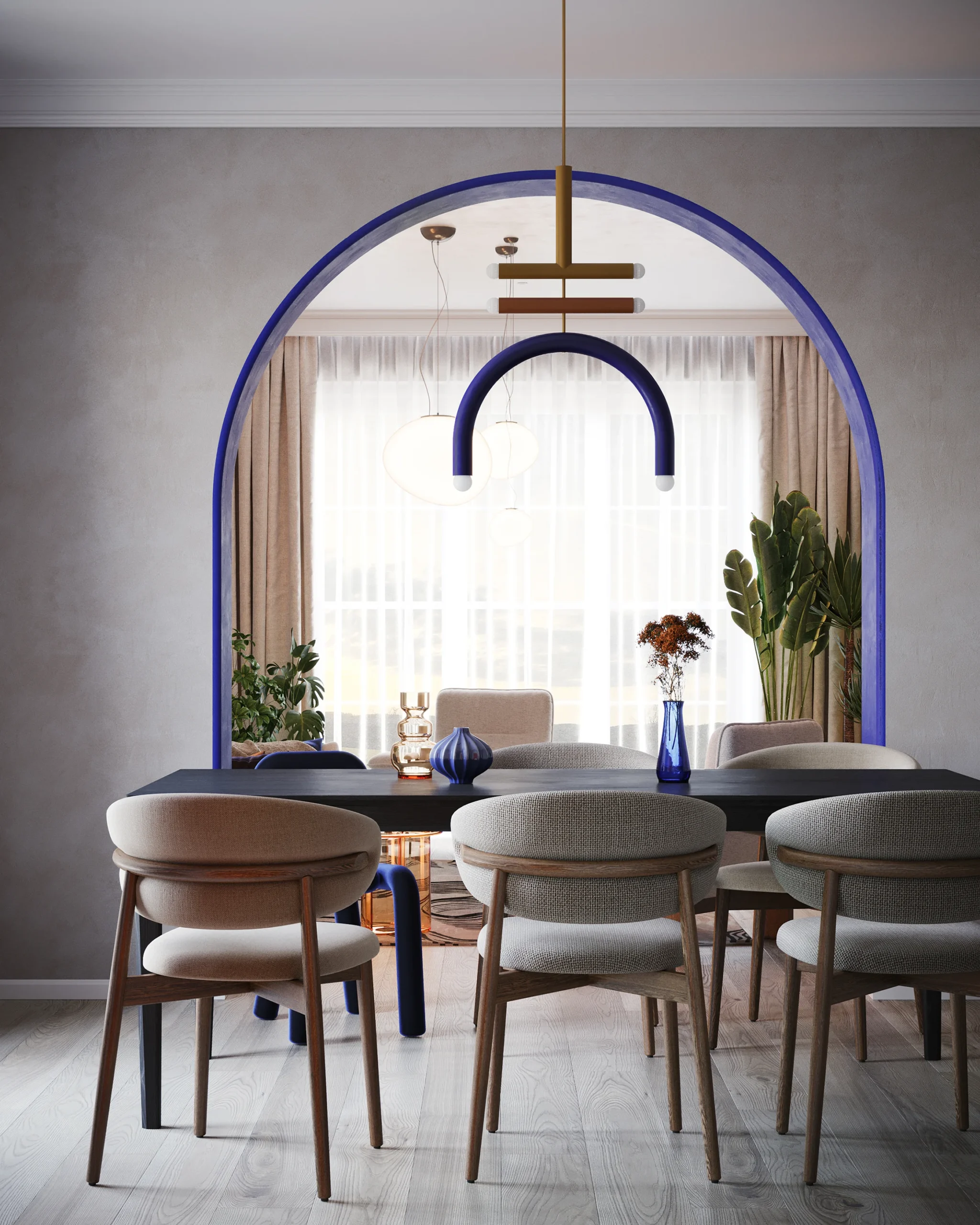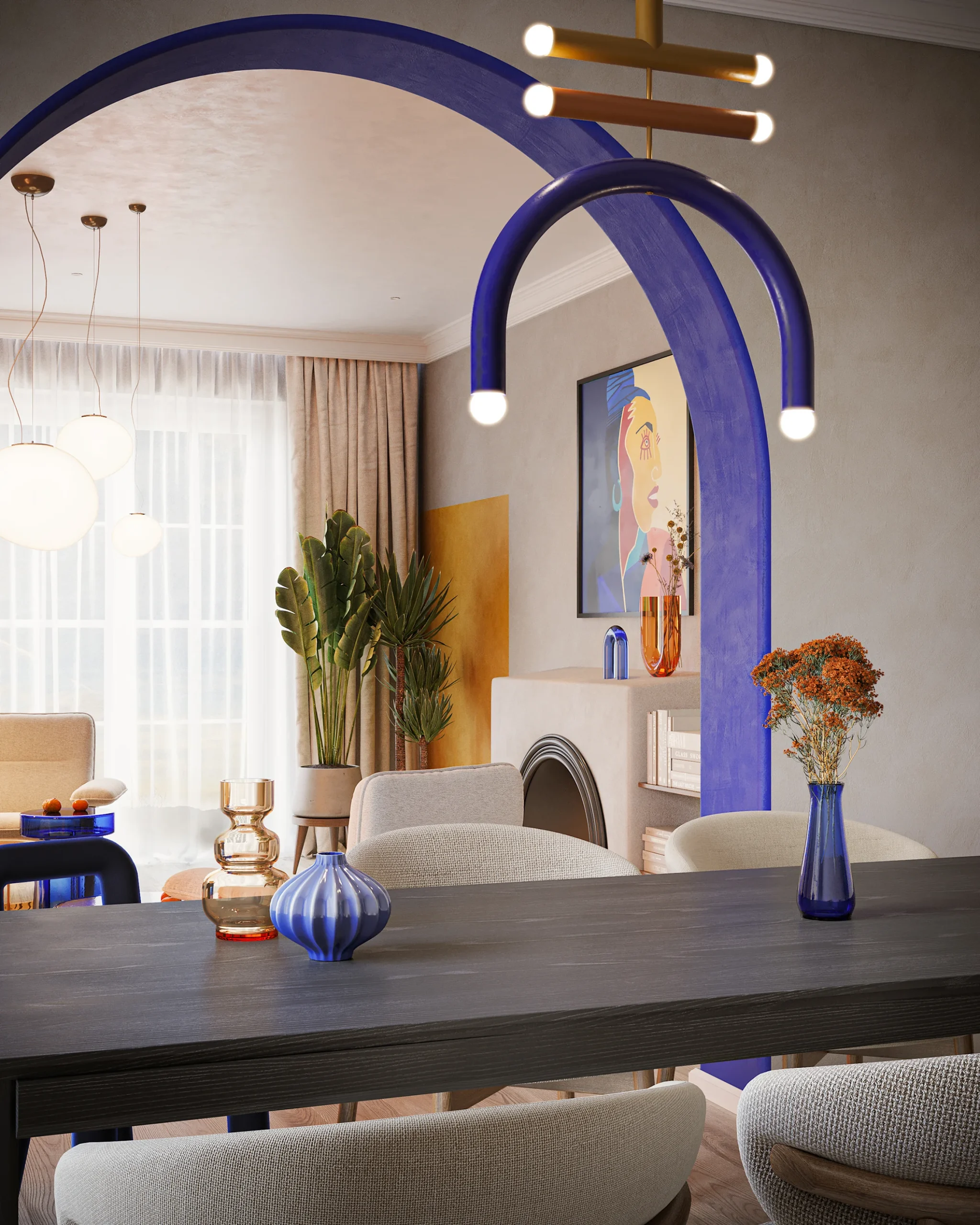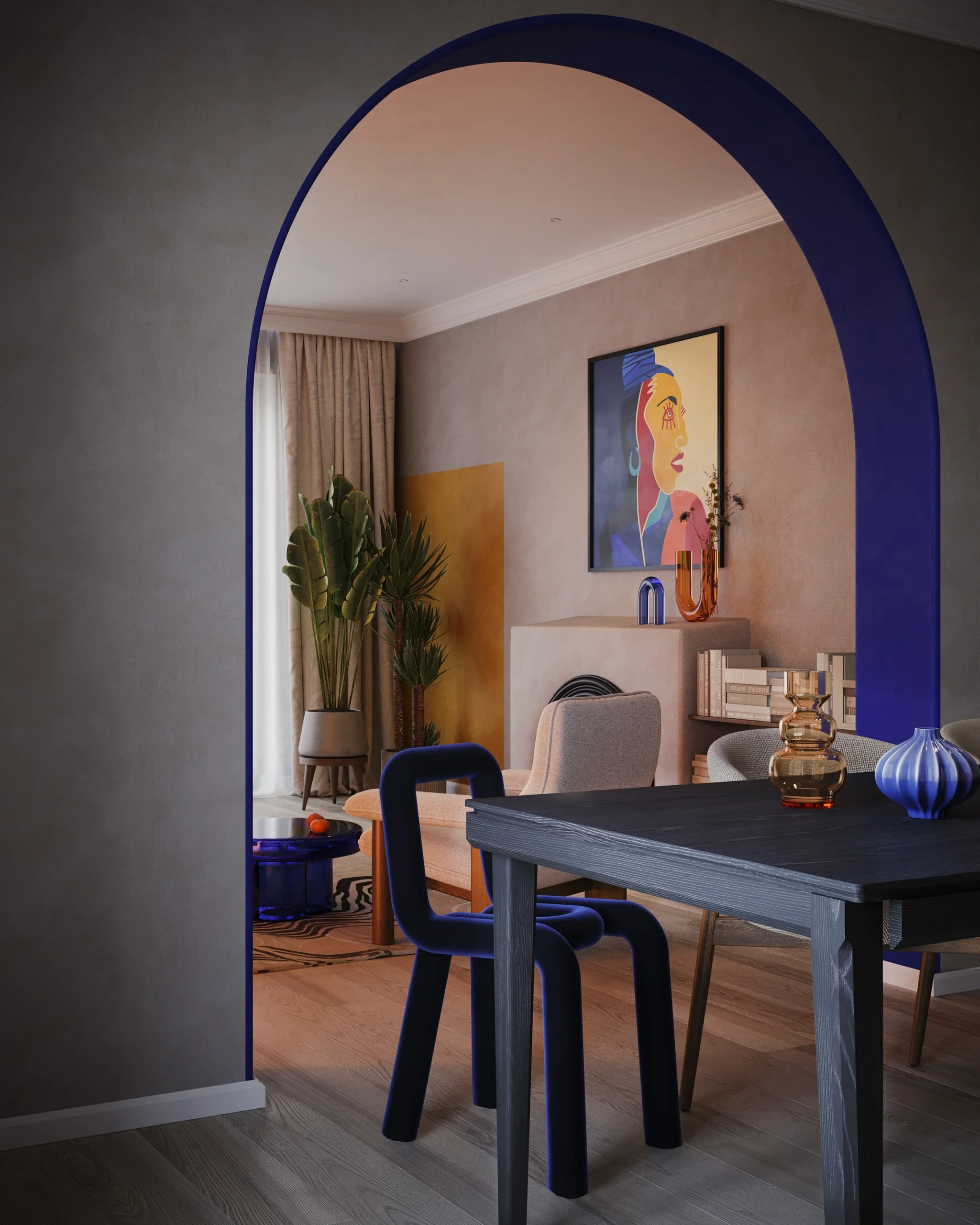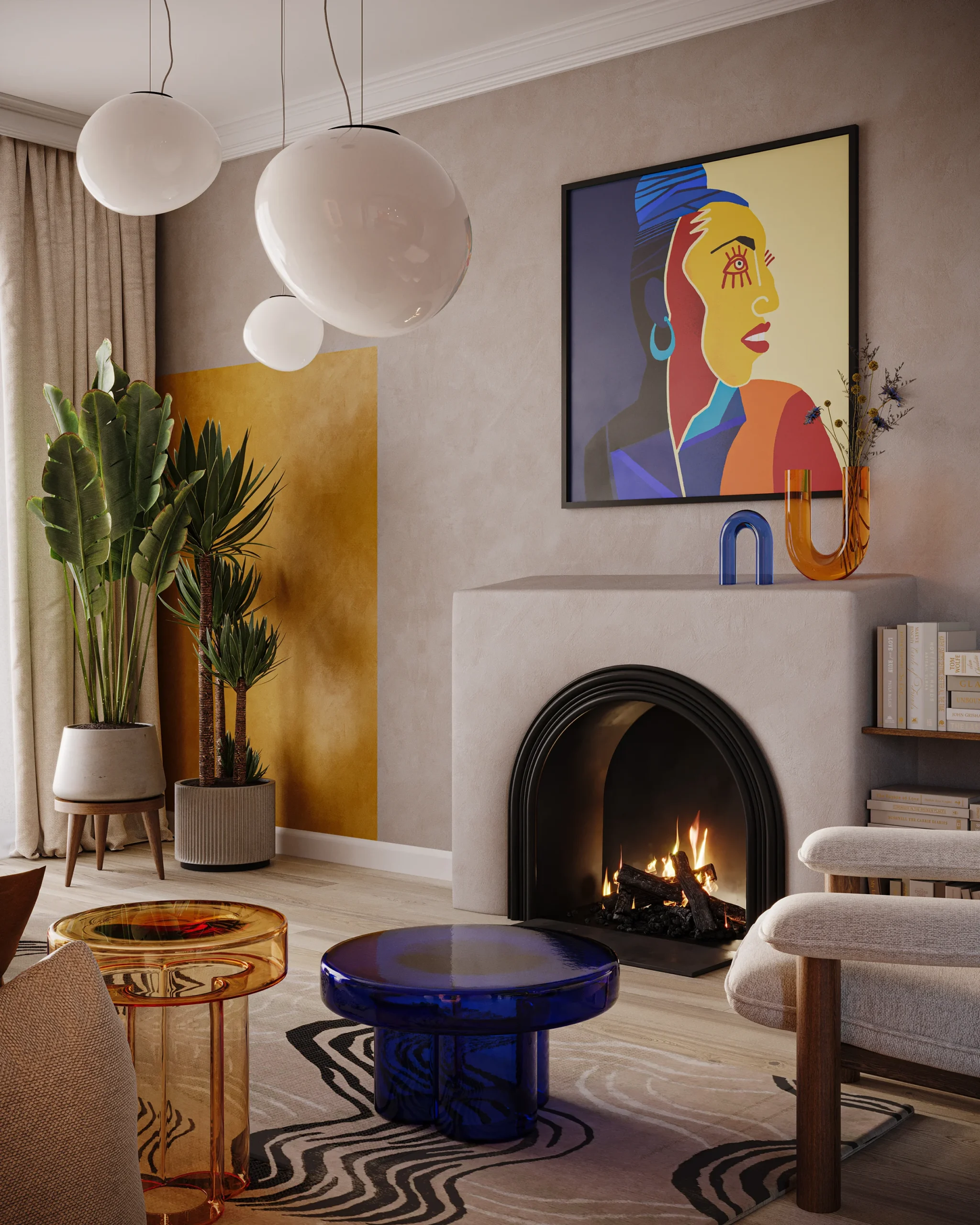 wnętrze o wyrazistym charakterze, w którym beżowa baza spotyka się z energetycznymi akcentami błękitu i pomarańczy. Subtelna elegancja przenika się tu z artystycznym duchem i lekko retro formą, tworząc przestrzeń pełną światła, ciepła i harmonii.