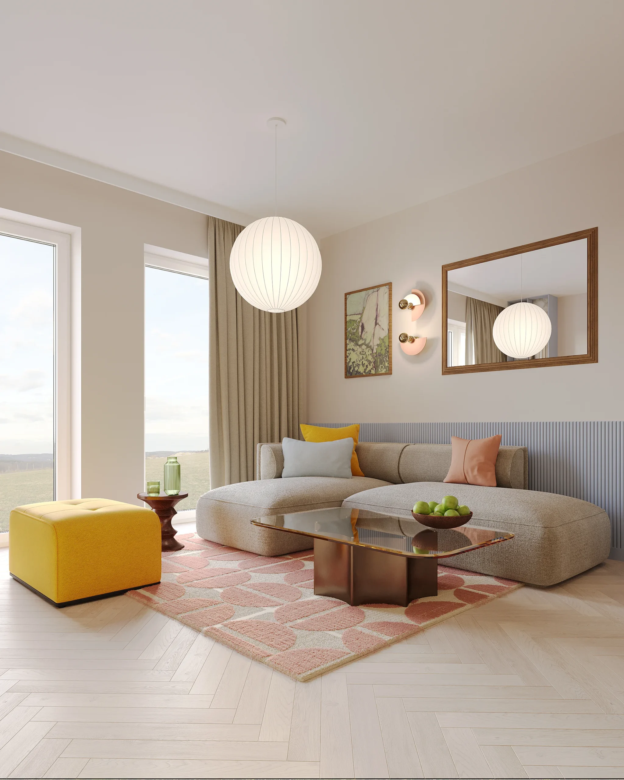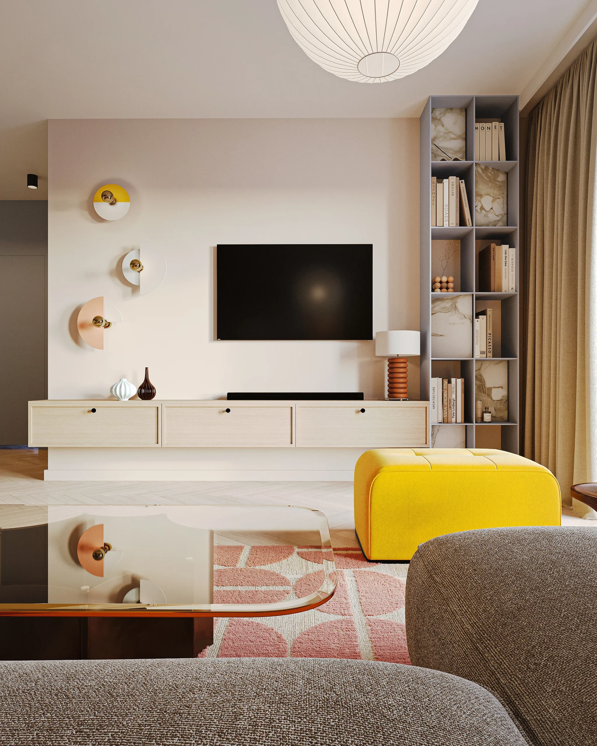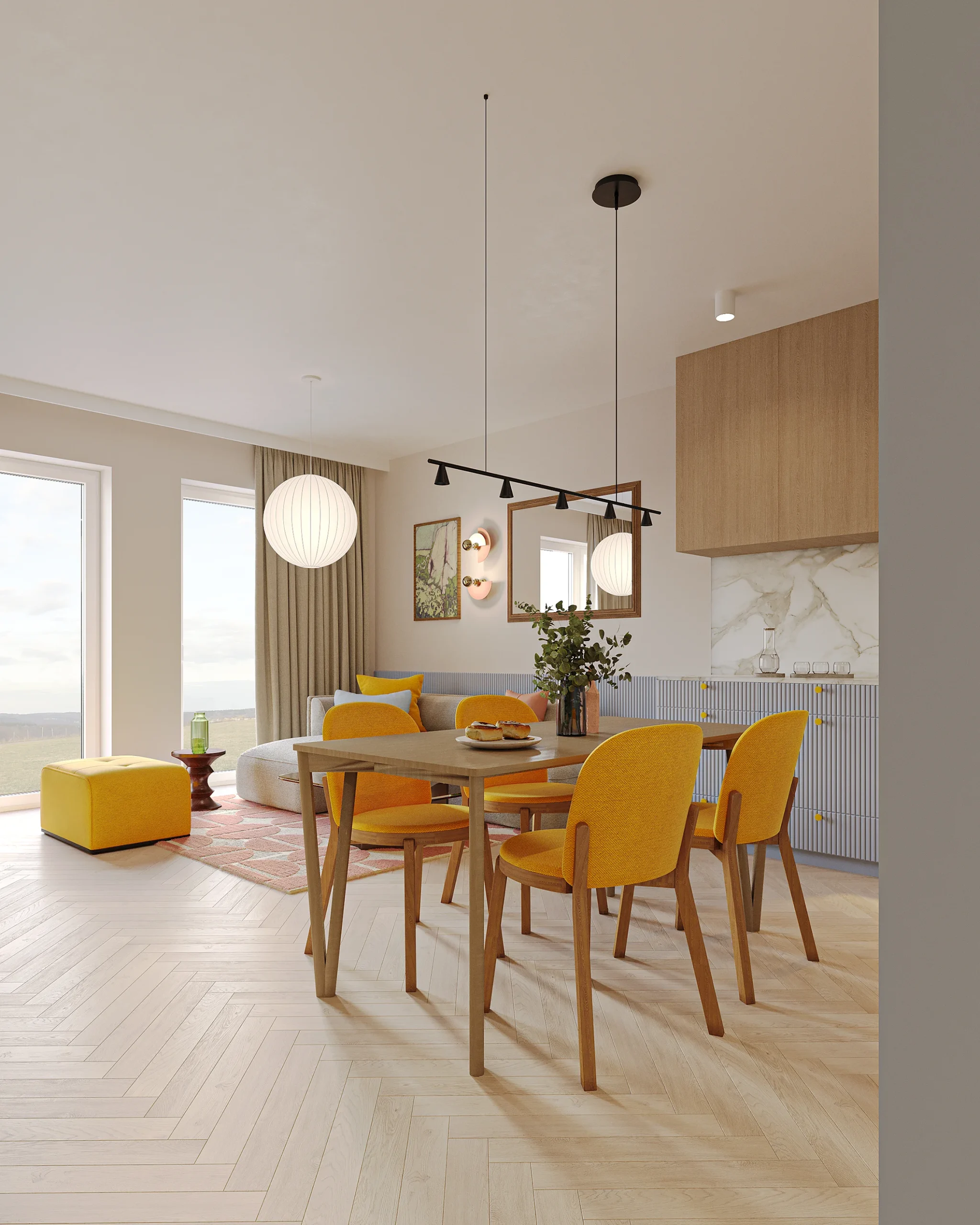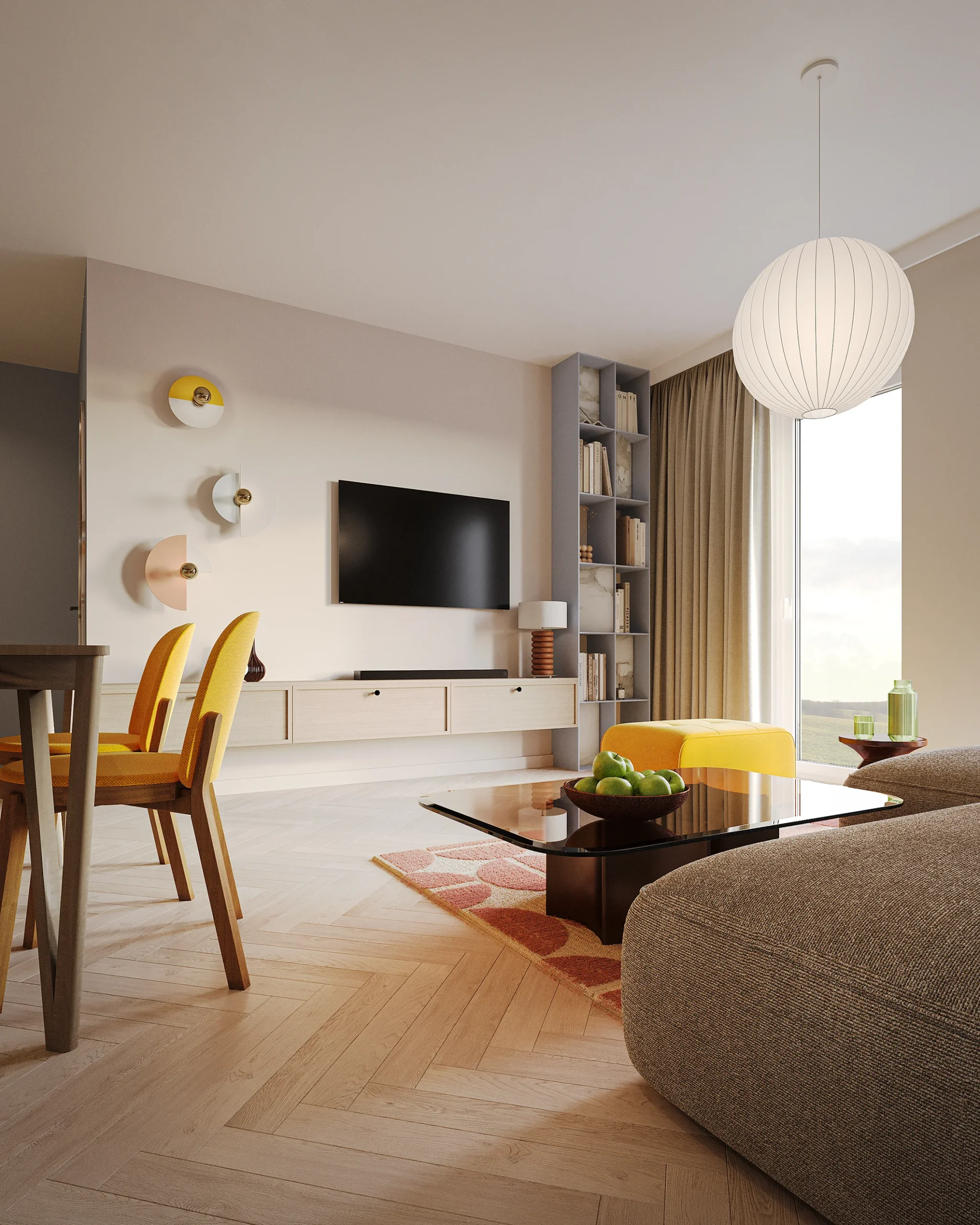Mieszkanie Łódź emanuje harmonią i lekkością. Jasne drewno, delikatne beże i energetyczne akcenty żółci tworzą pogodną przestrzeń, w której elegancja łączy się z codziennym komfortem.Architekt: So Architekci